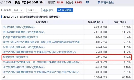 目前,华为哈勃持有长光华芯3.74%股份,位列第七大股东。截至发稿,长光华芯每股价格为95元,华为哈勃账面上的浮盈4亿元。