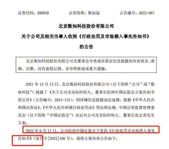 6月19日晚间,数知科技公告收到《行政处罚及市场禁入事先告知书》,公司实控人存在通过设立空壳公司套用上市公司资金的情形,金额巨大,而相关责任人因为没有证据自证清白,被作为其他责任人一起被给予行政处罚。