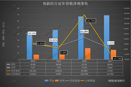 2021年,鱼跃医疗营业收入约68.94亿元,同比增加2.51%,增速创下多年来新低;归属于上市公司股东的净利润约14.82亿元,同比减少15.73%,这是鱼跃医疗上市以来首次出现归母净利润下滑。