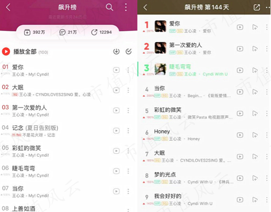 除了屠榜,王心凌的歌曲在各大音乐平台的总收听量、日收听量更是瞬间猛涨。