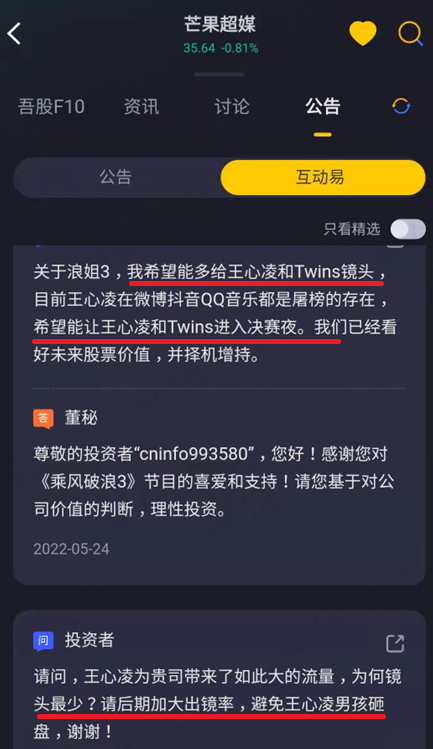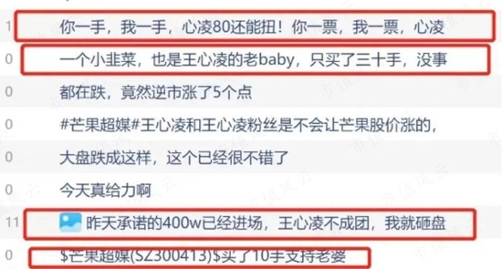 大量股民在评论区直接向公司喊话:不给王心凌镜头,不让王心凌晋级,就砸盘!就抛售公司股票!
