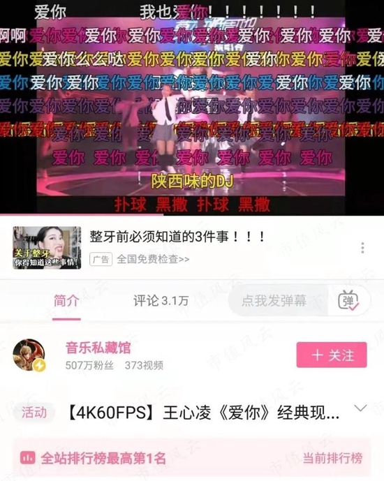 B站有一个王心凌演唱会版本的《爱你》视频。该视频5月23日上线,播放量直接突破1100万,点赞数突破50万,外加顶级的弹幕伺候。放眼望去,满屏弹幕全是“爱你”两字。直接霸屏了。
