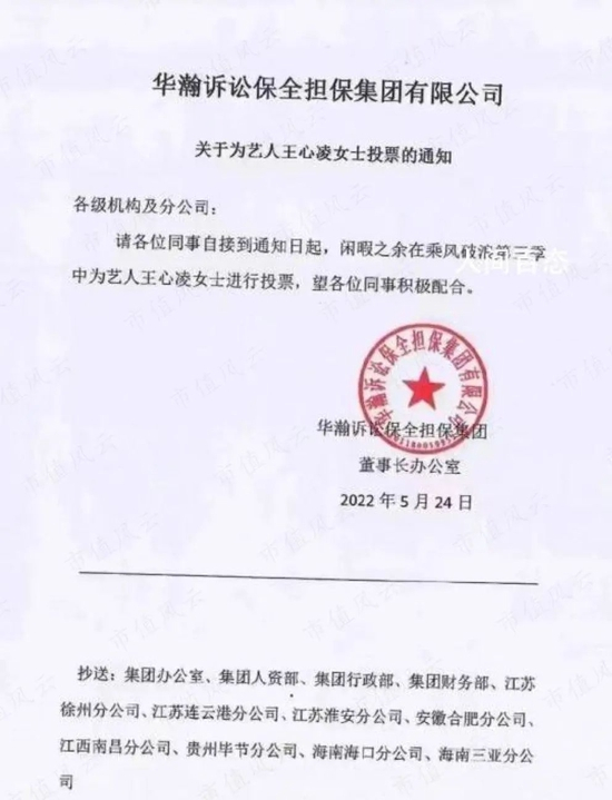 无独有偶,就在同一天,来自江苏的华瀚诉讼保全担保集团也发布了《关于为艺人王心凌女士投票的通知》,要求全国各地的同事在《浪姐3》中为王心凌进行投票。