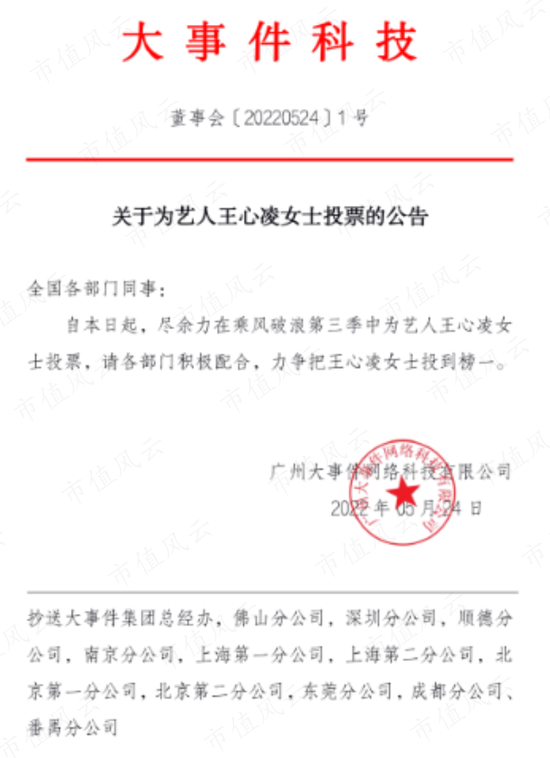 5月24日,一家名叫广州大事件网络科技有限公司(以下简称“大事件科技”)发布公告,号召全国各地员工去给《浪姐3》中的王心凌打榜,力争把王心凌投到榜一。