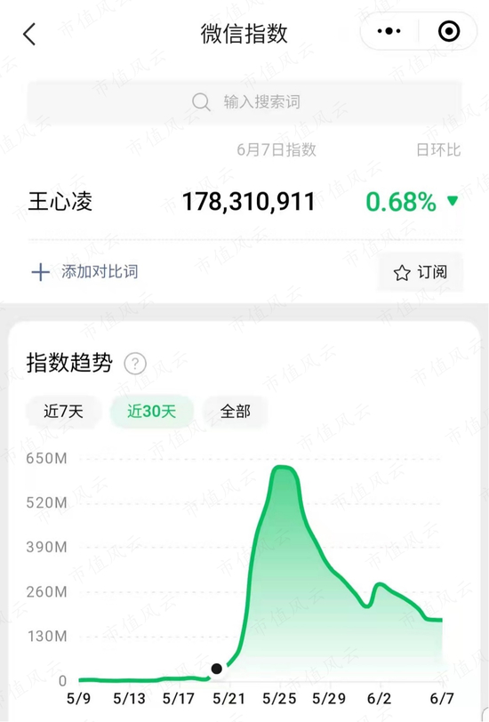 百度指数和微信指数都显示,王心凌最火的时间段大概在5月20日至5月30日。其中,她的微信指数的最高峰值,竟然达到惊人的6.25亿。尽管该指数进入6月份以后有所下降,但直到6月7日,依然保持在2亿左右。热度非常坚挺。