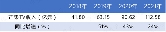 2018-2021年,芒果TV收入从41.8亿元持续增长至112.58亿元。2021年芒果TV收入的同比增速为24%。