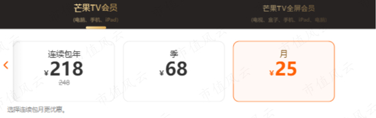 芒果TV官网显示,会员价格一个月是25元,一个季度是68元。如果连续包月或者连续包季,价格还会更低。这比一手的芒果超媒股票,可便宜多了。