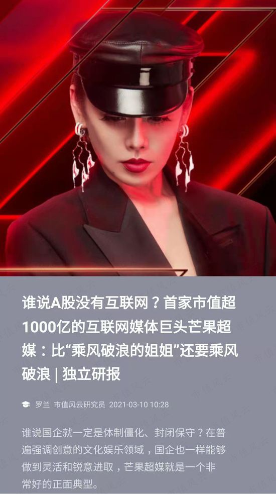 之前风云君写过一篇关于芒果超媒的万字重磅研报。该报告已经把公司的商业模式和财务数据分析得足够全面,大家可以下载市值风云APP去查看全文(如下图所示)。
