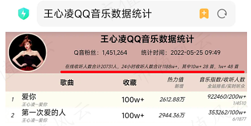 5月25日,王心凌迅速登顶QQ音乐华语女歌手第一,24小时收听人数突破1000万,仅次于周杰伦。