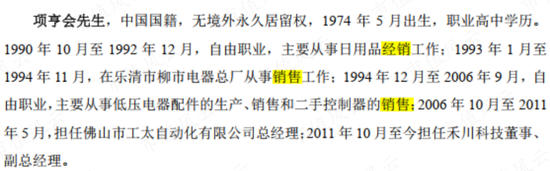 事实上,销售才是禾川科技核心创始团队底蕴更深的那部分,除了上文提到的联合创始人之一项亨会高中毕业后就在销售行业闯荡,公司的董事兼总经理徐晓杰也有着深厚的销售背景。