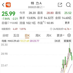 6月22日,特力A收报25.99元,跌7.84%。