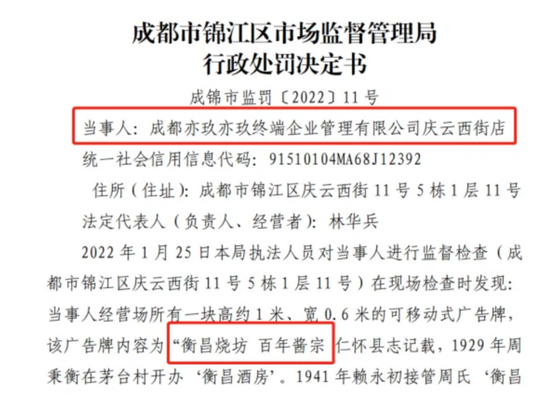 根据一份文书号为“成锦市监处〔2022〕51010422000237号”的行政处罚决定显示,今年1月25日,执法人员在成都亦玖亦玖庆云西街店(即1919庆云西街店)发现,经营场所有一块可移动式宣传制品,展示着关于衡昌烧坊的宣传内容。其内容显示,1929年开办的“衡昌酒房”后更名为“恒兴酒厂”,生产的酒先名“衡昌茅台”,后名“赖茅”。1953年7月茅台酒厂接办恒兴酒厂。同年8月,茅台酒厂正式取名“贵州省茅台酒厂”。这则营销故事虽然听上去如此壮丽而动人,但已经触碰法律法规的底线了。