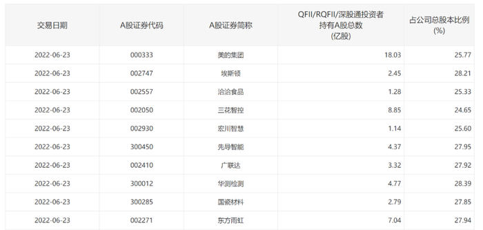 深市方面,据深圳证券交易所官网上的“QFII/RQFII/深股通投资者信息”栏目显示,截至6月23日,全市场一共有10只个股接近或已经超过26%的外资持股预警线。