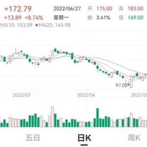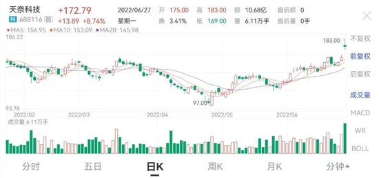 6月27日,天奈科技跳空高开,盘初大幅拉升涨超15%。截至收盘,公司涨幅8.74%,报172.79元/股,最新市值401亿元。