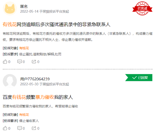 度小满旗下的有钱花更是频频被投诉暴力催收,匿名投诉称其暴力催收的方式主要是联系通讯录中的其他联系人,包括朋友、亲人,并以此方式进行恐吓威胁等。