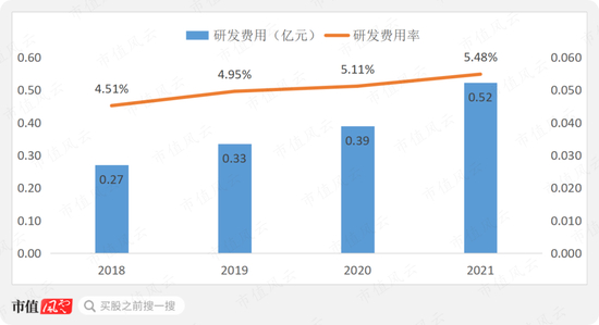 从研发投入来看,近几年公司持续加大研发投入,2021年研发费用率为5.48%。