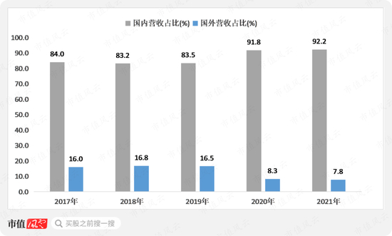 进一步分析,区别国内业务和出口业务,情况似乎有所不同。近两年公司国外营收占比大幅减少,国外营收占比从2019年的16.5%降至2021年的7.8%。公司营收主要由国内市场贡献。