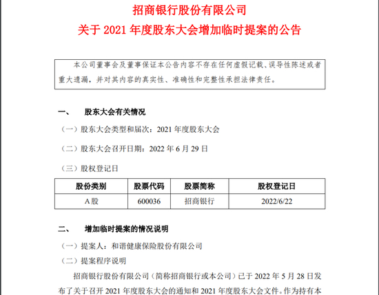 本次对于和谐健康的临时提案,6月29日上午,招商银行董事长缪建民回应称,和谐健康要求提名是合规的,充分尊重股东的董事提名权,也充分尊重本次股东大会的选举结果。