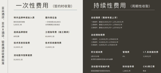根据此前亚朵(包括亚朵、亚朵X和轻居3个品牌)的一份加盟手册显示,加盟商签约时,需要支付每间客房5000元的特许品牌申请加入费;每店1万元技术系统安装费、5万元图书馆筹建费、8万元工程指导费、1.5万元技术系统撤场费,以及10万元履约保证金(合同期满后无息偿还,加盟期限为10年)。
