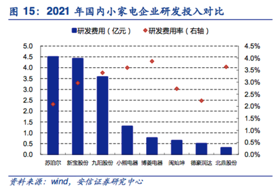 面对如此高比例分红,有声音认为苏泊尔应该加大研发投入,特别是在如今正处在抢占线上市场的关键阶段,需要不断开发新产品、新功能。数据显示,苏泊尔研发费用数额虽然较高,但研发费用占营收比重却在同类公司中处于较低水平,甚至不如新宝股份、博菱电器(873083.OC)、北鼎股份(300824.SZ)等以代工为主的企业。