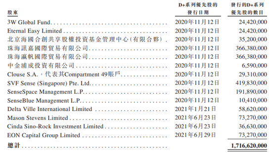 D+轮投资者包括包括软银中国、中金浦成、3W Partners、信达汉石投资(Cinda Sino-Rock)以及商汤创始人汤晓鸥(SenseSpace和SenseSpaceBlue)、Clouse S.A、SVF Sense、Delta Ville、Mason Stevens、EON Capital,其持有优先股数为1,716,620,000,共计融资7.03亿美元(大约55.04亿港元),目前其持有者或已亏损总计1.53亿美元(大约11.98亿港元)。