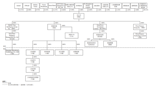 商汤科技上市前,占股权26.43%和投票权70.22%的汤教授与持有公司21.37%股份的Amind将在上市后同为控股股东;其他股东,Sense (Singapore) Pte. Ltd持有14.88%,SenseTalent持有12.17%,SVF淘宝中国持有7.59%。股权结构如下: