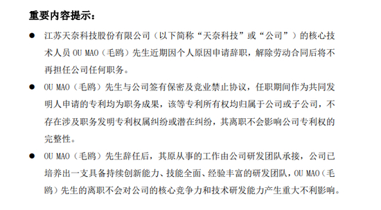 7月1日,碳纳米管龙头公司天奈科技公告,核心技术人员OU MAO(毛鸥)近期因个人原因申请辞职,解除劳动合同后将不再担任公司任何职务。