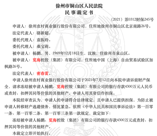 除此之外,爱企查显示,览海控股最近官司缠身。其开庭公告达14项,金融借款纠纷为6个,金融借款纠纷中原告均为徐州农村商业银行 ,申请冻结览海控股、自然人杨鹏的银行存款,法院经审查认为,符合规定,为防止被申请人转移财产逃避债务,情况紧急。合同纠纷为8个,包括劳动合同纠纷、租赁合同纠纷、买卖合同纠纷等。