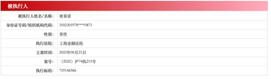 据中国执行信息公开网显示,密春雷被上海金融法院强制执行,执行标的达7.19亿元。一同被执行的还有览海控股(集团)有限公司和览海控股(集团)有限公司。