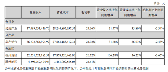 “东方财富”指出,滨江集团2021年的营业成本为285.47亿元,同比增长36.8%,高于营业收入32.8%的增速,导致毛利率下降2.2%。