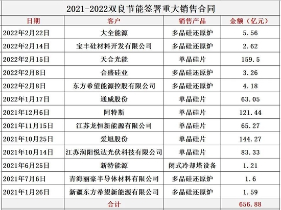 据统计,2021年至今,双良节能签署的重大销售合同(亿元以上)合同金额合计达656.88亿元,其中636.86亿元销售产品为单晶硅片。