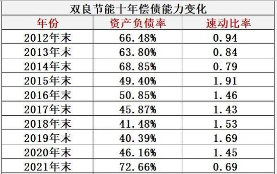 另一组数据显示,双良节能偿债能力已降至十年历史最低值,2021年末速动比率仅为0.69,2022年3月末降至0.65。