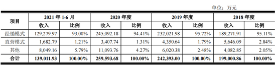 招股书显示,在经销收入为主的收入结构之下,2018~2021上半年,紫燕食品对其前员工经销商的销售金额在营收中的占比分别高达89.23%、86.61%、84.44%和79.58%,均在80%左右。