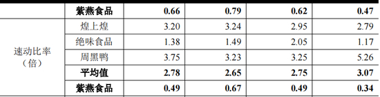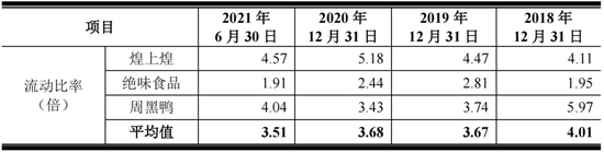 2018~2021上半年,紫燕食品的流动比率分别为0.47、0.62、0.79和0.66,速动比率分别为0.34、0.49、0.67和0.49。相比之下,同时段内,公司同行业上市公司的平均流动比率分别为4.01、3.67、3.68和3.51,平均速动比率则分别3.07、2.75、2.65和2.78。
