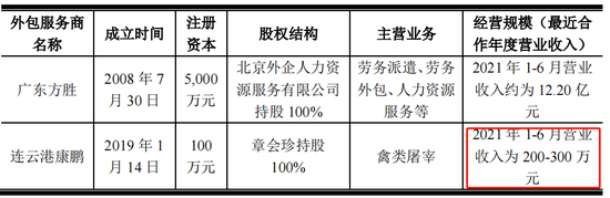 蹊跷的是,连云港康鹏成立于2019年,也就是说,在成立当年,它就成了紫燕食品唯二两家外包公司中的一家。而且,在2021年上半年,公司总营收仅200~300万元,而它承包紫燕食品活鸡屠宰业务带来的销售额则为235.02万元。