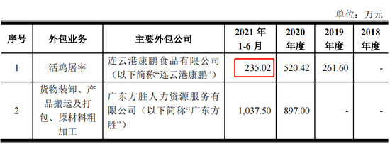 招股书显示,连云港康鹏是紫燕食品两家主要外包公司之一,主要负责活鸡屠宰业务。2019~2021年,公司与紫燕食品的交易金额分别为261.60万元、520.42万元和235.02万元。