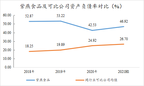 而就长期偿债能力来看,截至2021上半年末,紫燕食品的资产负债率也已经高达46.92%,其可比公司的资产负债率均值则仅为26.70%。