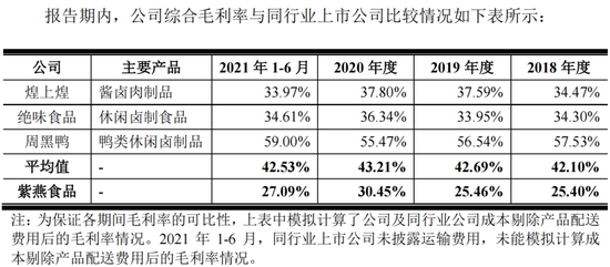 事实的确如此。据招股书,2018~2021上半年,紫燕食品的综合毛利率分别为25.40%、25.46%、30.45%和27.09%,相比之下,同行业公司的综合毛利率则分别为42.10%、42.69%、43.21%和42.53%。