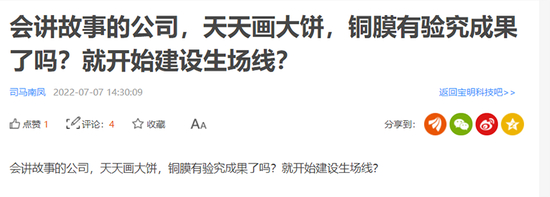 与股价暴涨形成鲜明对比的是市场对公司转型的质疑。作为一个原主业为LED背光源和液晶面板玻璃的公司,宝明科技此前和铜箔行业毫无交集,而公司此次投资的却是行业最前沿的技术——复合铜箔。技术、设备从哪里来?有股民在股吧中发帖表示,“会讲故事的公司,天天画大饼,铜膜有验(研)究成果了吗?就开始建设生场(产)线?”