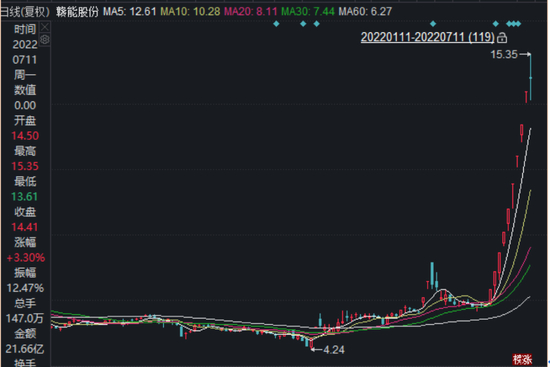 6月28日至7月8日,赣能股份接连9个交易日报收涨停板,而截至7月11日,公司股价上涨乏力,冲高15.35元/股的高点后开始回落,最后报收14.41元/股。