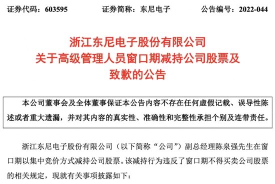 东尼电子昨日晚间发布公告称,副总经理陈泉强先生在窗口期以集中竞价方式减持公司股票,6月27日和28日,两日共卖出90.6万元,属于违规减持。东尼电子就此事向投资者致歉,并表示将以此为戒。