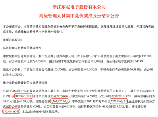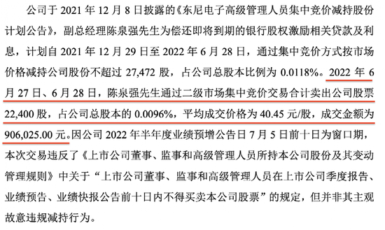 根据致歉公告,2022年6月27日、6月28日,东尼电子副总经理陈泉强先生,通过二级市场集中竞价交易合计卖出公司股票 22,400 股,占公司总股本的 0.0096%,平均成交价格为 40.45 元/股,成交金额为 906,025.00 元。