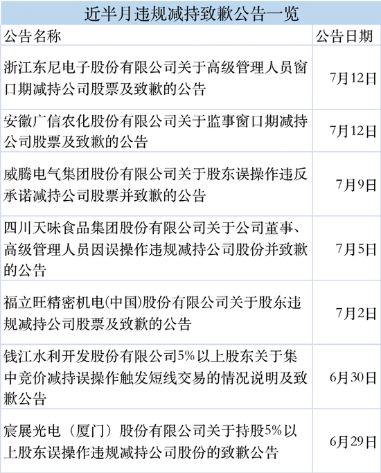 七月开始,中报陆续披露,上市公司股东和高管违规减持密集出现,近半个月以来共7家上市公司发布致歉公告。