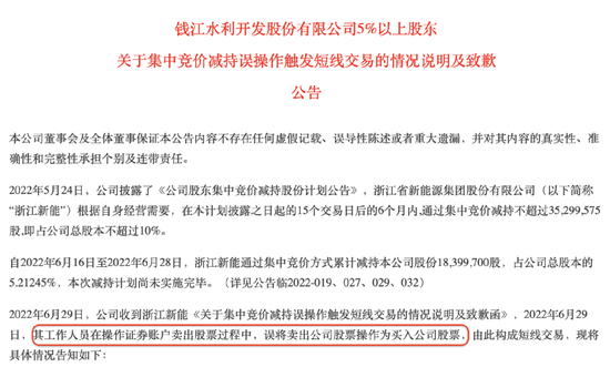此外,有些减持行为违规的原因并非是操作时间处于窗口期,而是触发了短线交易。钱江水利的股东浙江新能源表示,因为其工作人员的操作失误,将本应“卖出”的股票误操作为“买入”,由此构成了短线交易,构成违规。