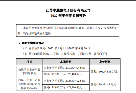 7月12日晚间,卓胜微披露2022年半年度业绩预告,预计2022年1-6月实现归属于上市公司股东的净利润为7.13亿元-7.64亿元,同比下降24.69%-29.72%;归属于上市公司股东的扣除非经常性损益的净利润为7.19亿元-7.69亿元,同比下降22.63%-27.66%。