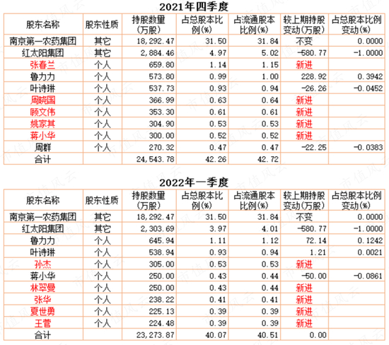 2020年以来,该公司流通股东持股数不断下降,主要是其控股股东南京第一农药集团及关联方红太阳集团不断减持所致,除此之外的其他流通股东(前十股东)持股数自2021年一季度至2021年四季度是保持增长状态。