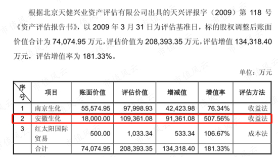 需要特别指出的是,安徽红太阳生化系安徽国星生物化学有限公司(简称安徽生化)重要全资子公司,2011年上市公司以溢价5倍的价格,即10.9亿元收购安徽生化。