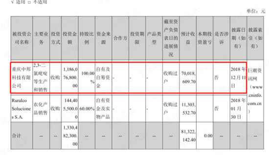 2018年12月11日,上市公司发布公告称,以11.86亿元收购红太阳集团全资子公司的重庆中邦科技有限公司(以下简称“重庆中邦”或标的公司)100%股权。