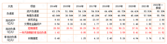 2022年一季度末,公司流动资产中的货币资金2.8亿元,交易性金融资产1.7亿元,二者合计只有4.5亿元。但是,上市公司的短期借款却高达37亿元,此外,还有11.5亿元的一年内到期的非流动负债,二者合计48.5亿元。