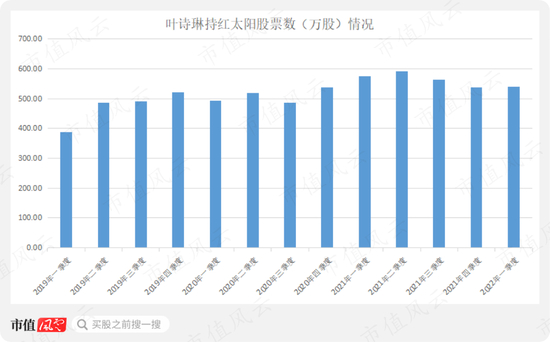 在个人股东中,叶诗琳是持有红太阳股票较长的一位,2019年一季度开始现身前十大流通股股东列表,持仓数从最初的388万万股,增加至最新一期的539万股,期间持股数一度接近600万股。